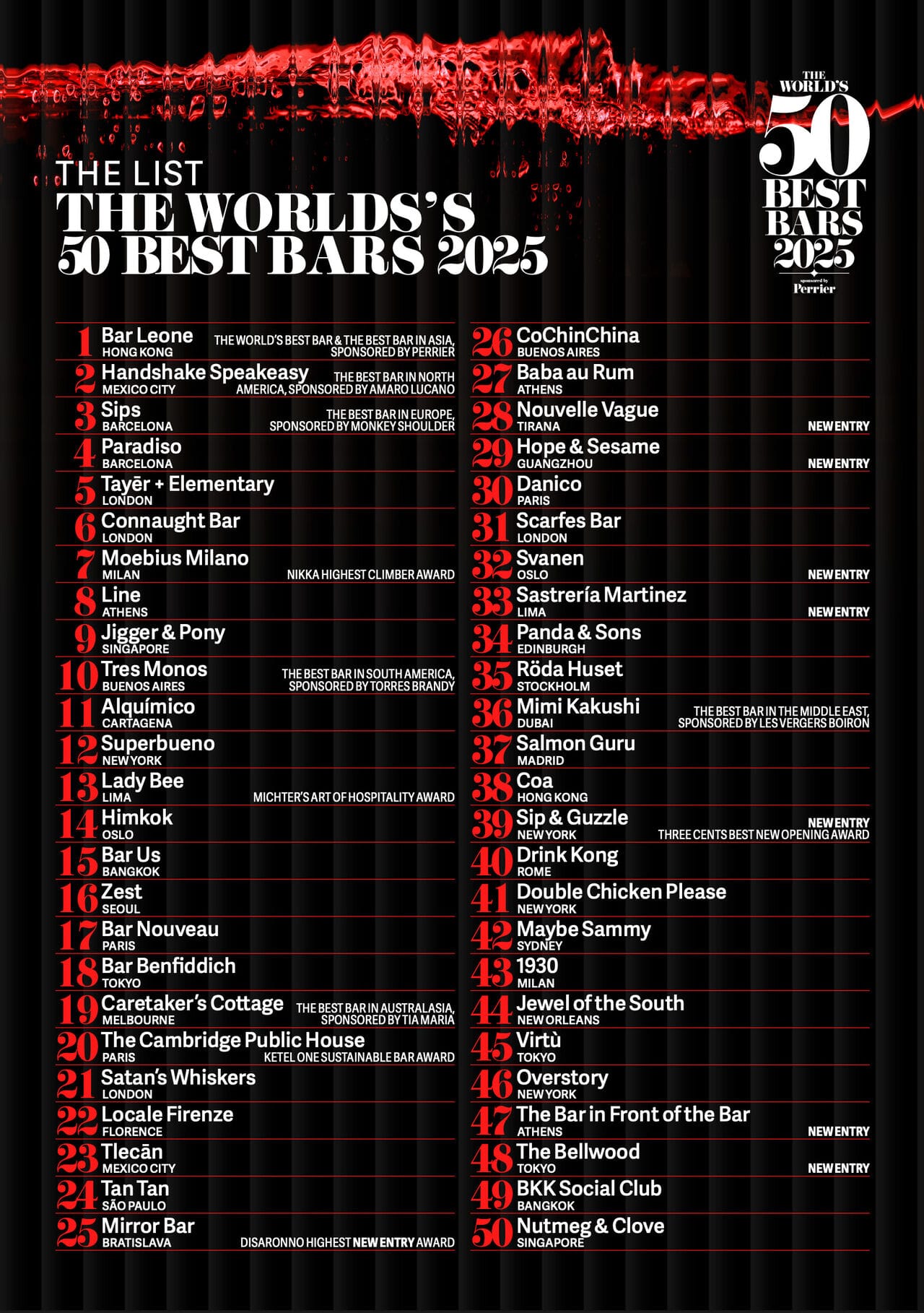 LONDON, Oct. 8, 2025 — The list of The World's 50 Best Bars 2025, sponsored by Perrier, was revealed at a live awards ceremony in Hong Kong. The annual event once again united the global bar community for its 17 edition in recognition of the outstanding achievements of their peers.