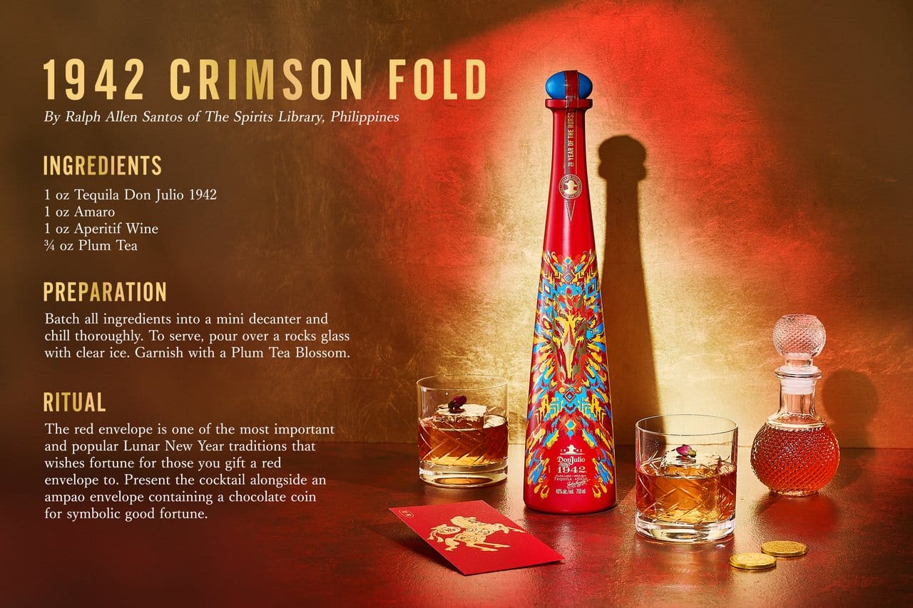 - 1942 Crimson Fold: A refined fusion of rich agave with velvety fruit and aromatic depth, poured tableside from a mini decanter for an elevated moment. Paired with a lucky red envelope and chocolate coin, this serve blends elegance and auspicious tradition with unmistakable smoothness. –Created by Ralph Allen Santos of The Spirits Library, Philippines.