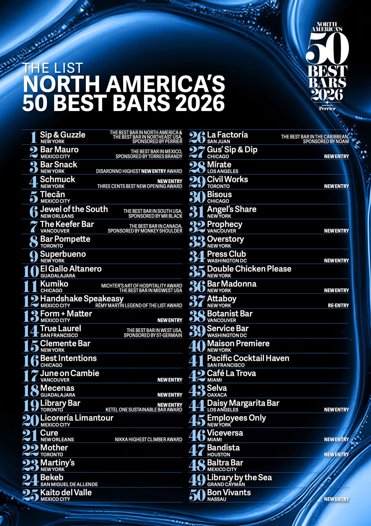 The list of North America's 50 Best Bars was announced at a live awards ceremony at the Vancouver Convention Centre, celebrating the very best of the region's cocktail industry. This was the second year in a row the awards were held in Vancouver, highlighting Canada's growth as a leader in North America's cocktail scene. The annual ranking showcases standout bars from across the US, Mexico, Canada and the Caribbean, recognizing excellence in drinks, hospitality and innovation.