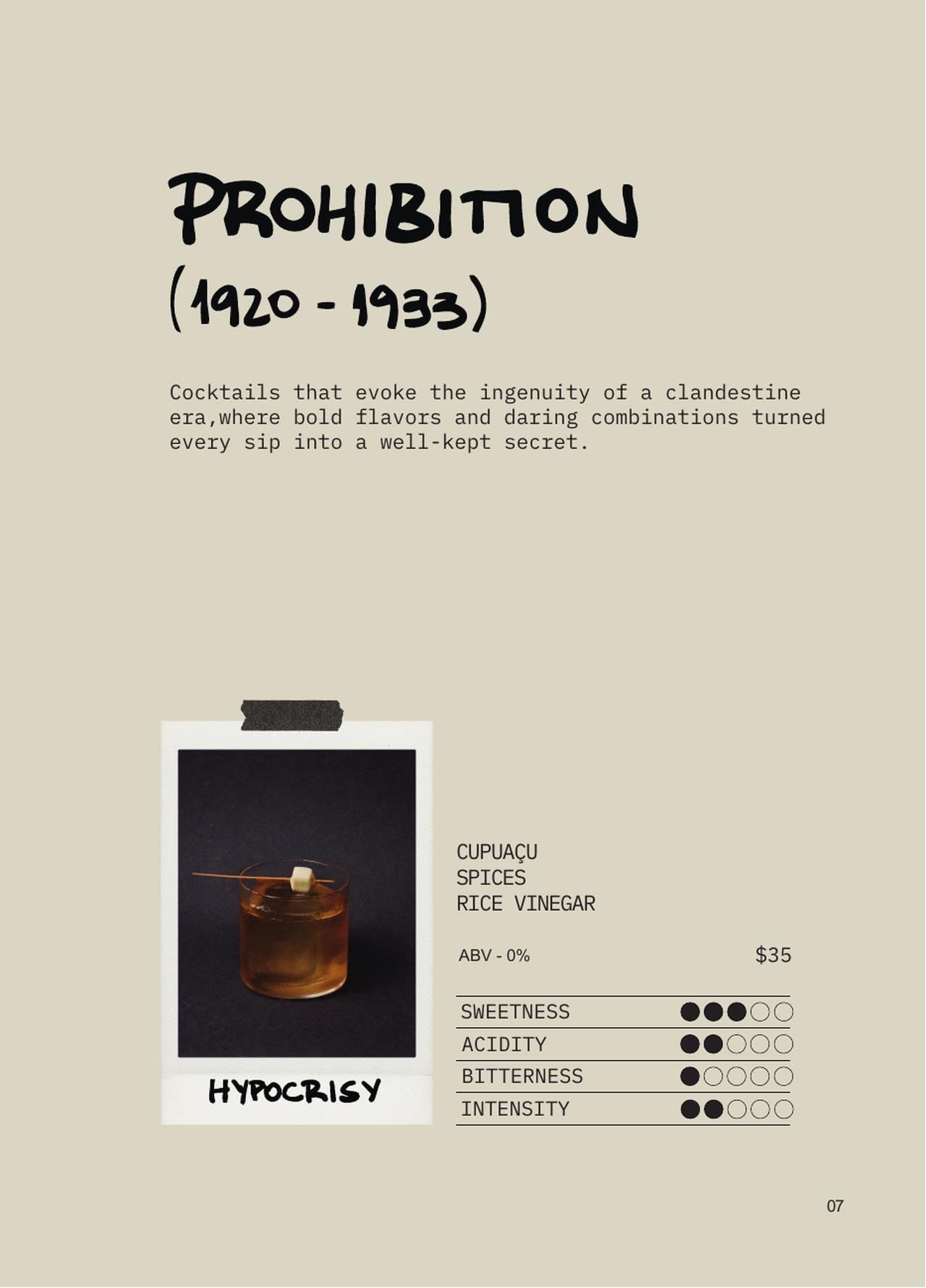 Our current menu, Pour-Hibition, is inspired by the Prohibition era in the United States. We divided the drinks into three periods: before, during and after Prohibition, looking at how cocktails changed—their strength, complexity, and other traits. The aim wasn’t to give a history lesson but to spark reflection on our relationship with alcohol: why do we drink? Why, at a time when it was banned, did everyone keep drinking? We wanted to bring those questions to the bar.